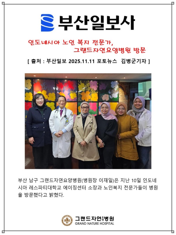 [부산일보] 인도네시아 노인 복지 전문가, 그랜드자연요양병원 방문 페이지 정보 작성자 최고관리자 작성일25-11-17 11:55 조회65회 댓글0건 다음글 목록 본문 [ 출처 : 부산일보 2025. 11.11 포토뉴스 김병군 기자 ] 댓글목록 등록된 댓글이 없습니다. 다음글 목록