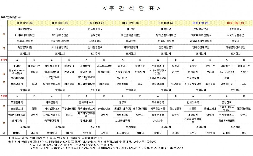 주간 식단표 (1월 2주) 페이지 정보 작성자 최고관리자 작성일26-01-08 12:07 조회18회 댓글0건 다음글 목록 본문 주간 식단표 (1월 2주) 댓글목록 등록된 댓글이 없습니다. 다음글 목록