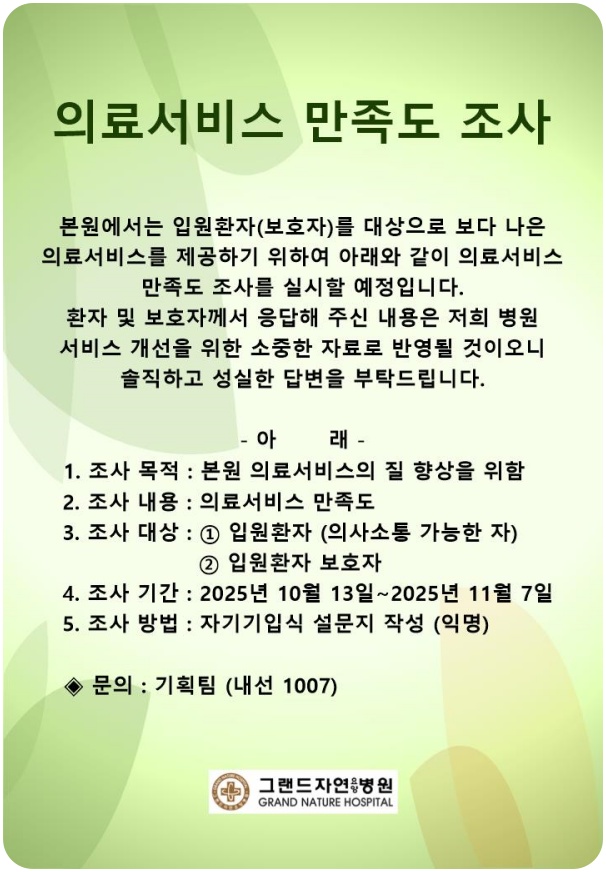 의료서비스 만족도 조사(2025년10월13일~11월7일) 페이지 정보 작성자 최고관리자 작성일25-10-10 12:24 조회167회 댓글0건 이전글 다음글 목록 본문 의료서비스 만족도 조사 댓글목록 등록된 댓글이 없습니다. 이전글 다음글 목록