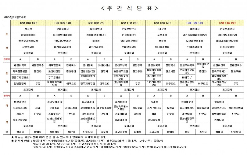 주간 식단표 (12월 2주) 페이지 정보 작성자 최고관리자 작성일25-12-05 12:00 조회20회 댓글0건 다음글 목록 본문 주간 식단표 (12월 2주) 댓글목록 등록된 댓글이 없습니다. 다음글 목록