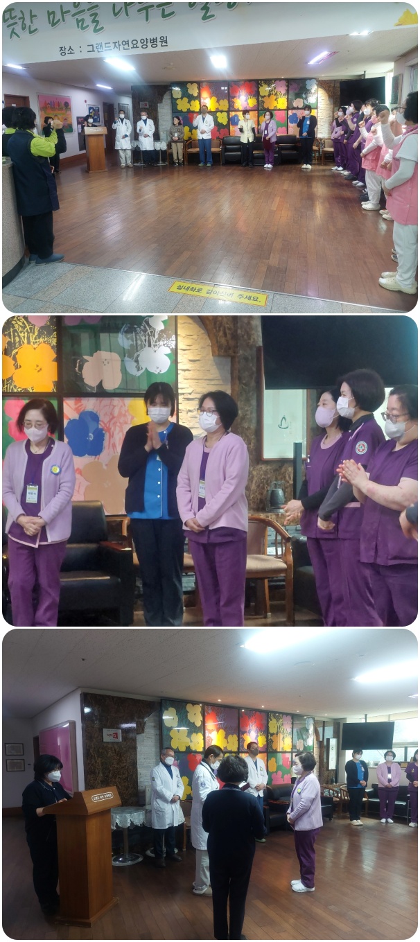 2월 월례회 가져. 페이지 정보 작성자 최고관리자 작성일26-02-10 15:30 조회12회 댓글0건 다음글 목록 본문 그랜드자연요양병원은 2월 2일 1층 로비에서 전 직원들이 참석한 가운데 그랜드자연 월례회를 가졌다. 환절기 어르신들의 건강 관리에 만전을 기하자고 강조하였으며, 이어서 신입직원들의 인사와 공로상 전달이 이어졌고 QPS위원회 위원과 감염관리위원회 위원의 새로이 임명되는 위원에 대한 임명장을 수여하였다. 댓글목록 등록된 댓글이 없습니다. 다음글 목록