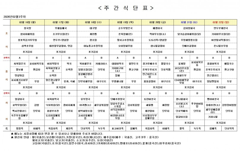 주간 식단표 (2월 3주) 페이지 정보 작성자 최고관리자 작성일26-02-13 09:44 조회35회 댓글0건 다음글 목록 본문 주간 식단표 (2월 3주) 댓글목록 등록된 댓글이 없습니다. 다음글 목록