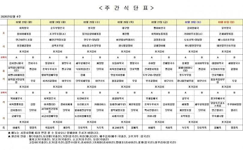 주간 식단표 (2월 4주) 페이지 정보 작성자 최고관리자 작성일26-02-20 10:32 조회55회 댓글0건 이전글 다음글 목록 본문 주간 식단표 (2월 4주) 댓글목록 등록된 댓글이 없습니다. 이전글 다음글 목록