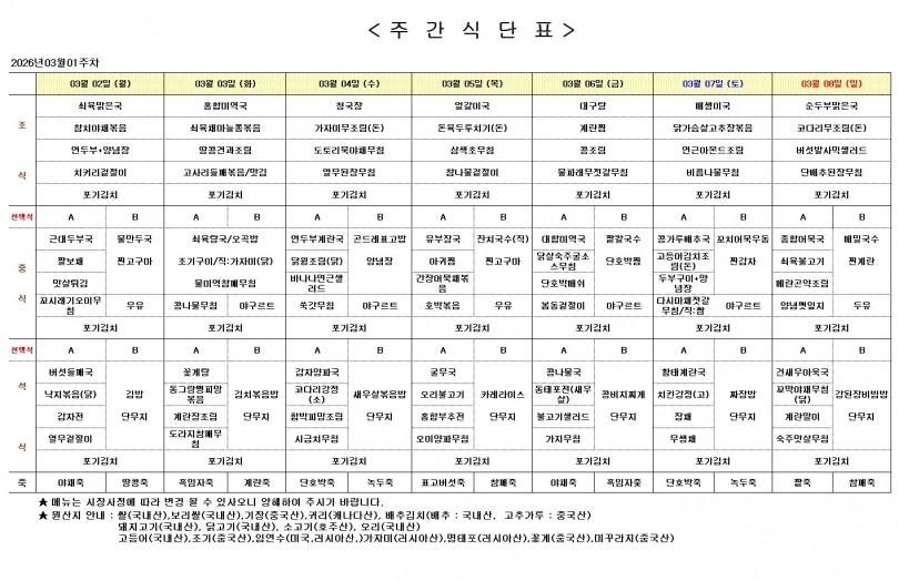 주간 식단표 (3월 1주) 페이지 정보 작성자 최고관리자 작성일26-02-27 11:46 조회6회 댓글0건 다음글 목록 본문 주간 식단표 (3월 1주) 댓글목록 등록된 댓글이 없습니다. 다음글 목록