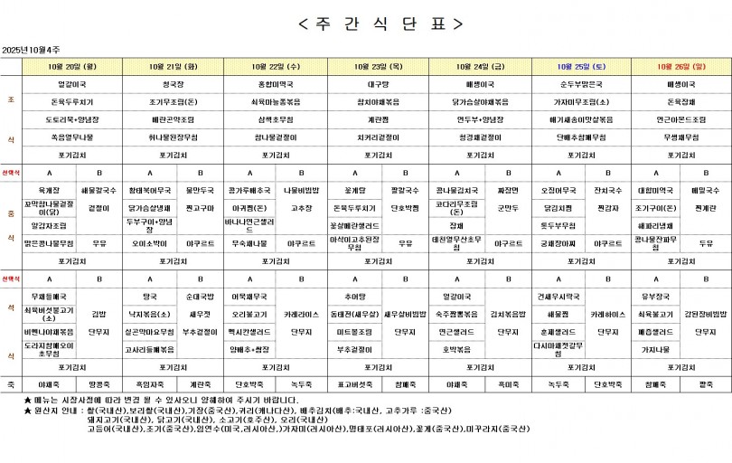 주간 식단표 (10월 4주) 페이지 정보 작성자 최고관리자 작성일25-10-17 10:49 조회11회 댓글0건 다음글 목록 본문 주간 식단표 (10월 4주) 댓글목록 등록된 댓글이 없습니다. 다음글 목록