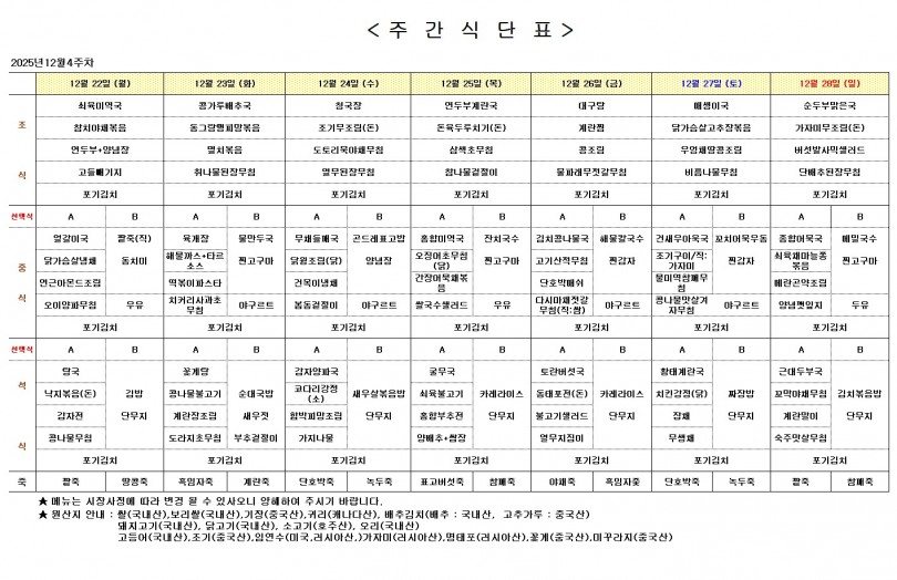 주간 식단표 (12월 4주) 페이지 정보 작성자 최고관리자 작성일25-12-19 10:44 조회41회 댓글0건 다음글 목록 본문 주간 식단표 (12월 4주) 댓글목록 등록된 댓글이 없습니다. 다음글 목록